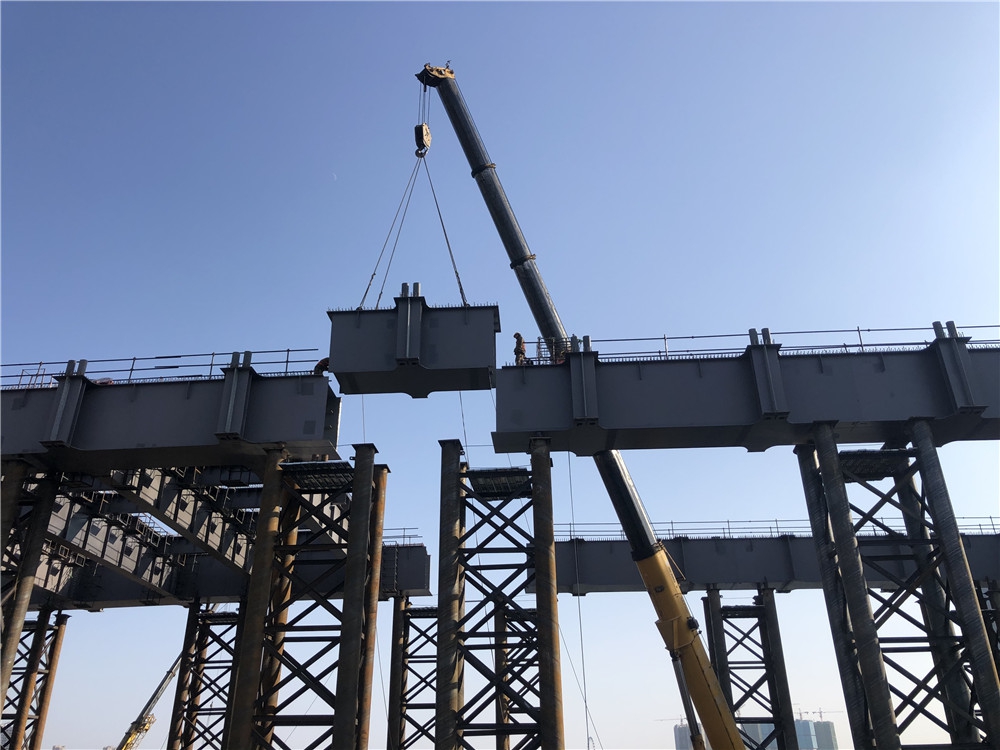 “復雜的吊裝條件為施工帶來了巨大挑戰,鋼梁制作難度較大、拼裝精度要求較高,在緊張工期內合理安排鋼梁施工是順利完成工期目標的重要條件。”武漢路祊河橋工程項目負責人吳仕鋒表示。為確保此次鋼梁架設順利合龍,吊裝前,項目部組織現場施工人員召開了施工專題會議,并對運梁路線、施工區域等進行了實地勘測考察,提前部署。吊裝作業時,現場技術人員與施工作業人員分工明確、指揮到位、緊密配合,整個吊裝過程一氣呵成,在確保吊裝安全的前提下保障了施工的順利進行。