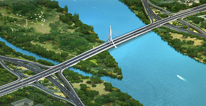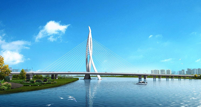 梭形獨(dú)塔斜拉橋設(shè)計(jì)注重結(jié)構(gòu)本體的景觀功能及橋體與沿河景觀規(guī)劃的協(xié)調(diào),其結(jié)構(gòu)形式靈活,造型美觀,集“功能、景觀”為一體。主橋采用獨(dú)塔混合梁斜拉橋,主塔采用空間異型結(jié)構(gòu),全高105米。全橋共設(shè)28對斜拉索,岸上段引橋采用預(yù)應(yīng)力混凝土連續(xù)箱梁,跨徑36~43米。立交匝道橋采用普通鋼筋混凝土連續(xù)梁及預(yù)應(yīng)力混凝土連續(xù)梁兩種結(jié)構(gòu)形式,跨徑20~30米。人行梯道采用鋼筋混凝土結(jié)構(gòu),橋?qū)?.1米。