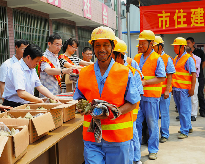 6月17日上午,市住建局組織開展了端午節(jié)“送粽子、送溫暖” 志愿服務(wù)活動(dòng)。 市住建局副局長陳云祥帶隊(duì)到公司承建的內(nèi)環(huán)東線溫泉路工地, 為奮戰(zhàn)在施工一線的工人發(fā)放粽子、 毛巾、 水杯等慰問品。