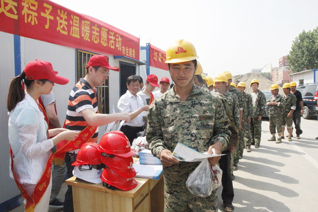 5 月29 日上午,市住建委組織開展了 “送粽子、 送溫暖”志愿服務活動。 市住建委副主任陳云祥帶隊到公司承建的涑河南街下穿沂蒙路道路工地, 為奮戰(zhàn)在施工一線的工人發(fā)放粽子、 毛巾、礦泉水等慰問品。