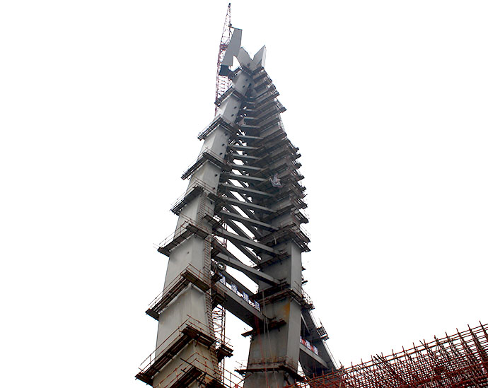 西安路祊河橋全長777.4米,由主橋、水中段引橋、岸上段引橋、兩岸立交匝道橋及人行梯道橋組成。主橋為獨塔混合梁斜拉橋,橋跨布置110+110米,鋼結構塔全高105米,主梁采用鋼-混凝土混合梁,梁高3.5~6.5m,全橋共設28對斜拉索。西安路祊河大橋鋼結構塔柱中塔12節,兩側邊塔各10節,共32節,日前全部吊裝完成,下一步將進行焊接固定和連桿施工。