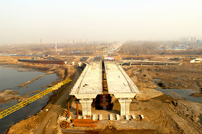 春節臨近,大橋參加各方相互配合、共同努力,負責施工的一公司合理組織人員機械,加班加點,努力按原計劃完成施工任務。目前,大橋已完成總工程量的63%,其中,灌注樁基礎共完成262顆,完成總量的96%;承臺、墩臺柱施工各完成60個,完成總量的96%。主橋混凝土梁0#施工完成,1#塊東側箱梁支架、模板施工完成,西側箱梁底模板完成,底腹板鋼筋綁扎30%。西側鋼箱梁吊裝全部完成,焊接施工完成70%;東側支架完成兩排,鋼結構陸續進場。西岸陸上引橋支架搭設80%;西岸水中引橋第一聯北幅頂板鋼筋模板施工完成50%,南幅頂板鋼筋模板施工完成30%;西岸水中引橋第二聯、東岸陸上引橋、東岸水中引橋施工全部完成。WS和NW匝道橋箱梁第一聯混凝土澆筑完成。NE、ES地道橋施工完成。SE、NE匝道路基回填全部完成,具備水穩碎石攤鋪條件。排水管道施工完成2000余米。