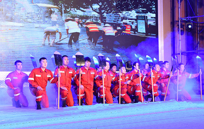 本次晚會緊緊圍繞“工人偉大?勞動光榮”的主題展開,為勞動者贊頌,為建設者喝彩。公司選送的舞蹈《筑路金剛》以寫實的藝術手法,再現了高溫酷暑下,一線市政工人頂著炎炎烈日,冒著蒸騰的熱浪,身邊是滾燙的瀝青,為了完成施工任務,加班加點、拼搏奉獻的故事。參加演出的18名演員全部為路面公司的一線職工,從各個項目、各個工地抽調集中排練。參演職工將市政人能打敢拼的精神帶上了舞臺,以昂揚向上的面貌、激情陽剛的演出,震撼了全場,充分展示了市政鐵軍的風采。