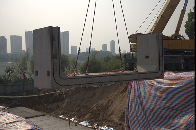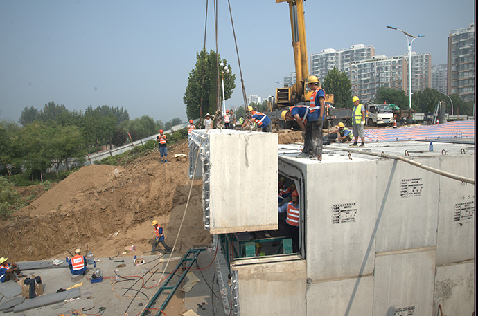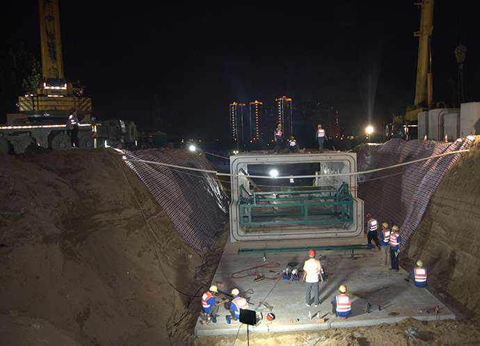 為盡可能降低交通影響,該工程仍采用晝夜連軸轉的作業方式,在上周康和路過街通道施工的基礎上,我公司在開工前對施工方案進行了再優化,尤其是采取了多項改進措施,大大縮短了預制預應力方涵的吊裝時間。