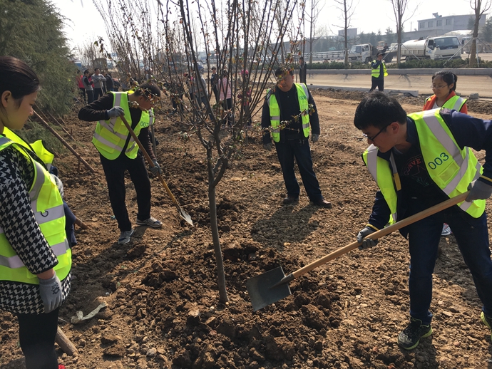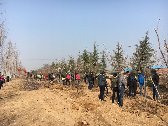 北京東路改造工程已進入沖刺階段,各項施工正在緊鑼密鼓、熱火朝天地推進。此次義務勞動在北京東路最東段的綠化施工現場進行,主要是栽植部分背景林樹木。在勞動現場,大家熱情高漲,干勁十足,樂在其中。家人們分成小組,互相合作,刨土挖坑、抬樹栽種、壘土圍堰、撿拾石塊、修剪樹枝。不到一上午時間,共栽植櫻花、垂絲海棠等樹木100棵。