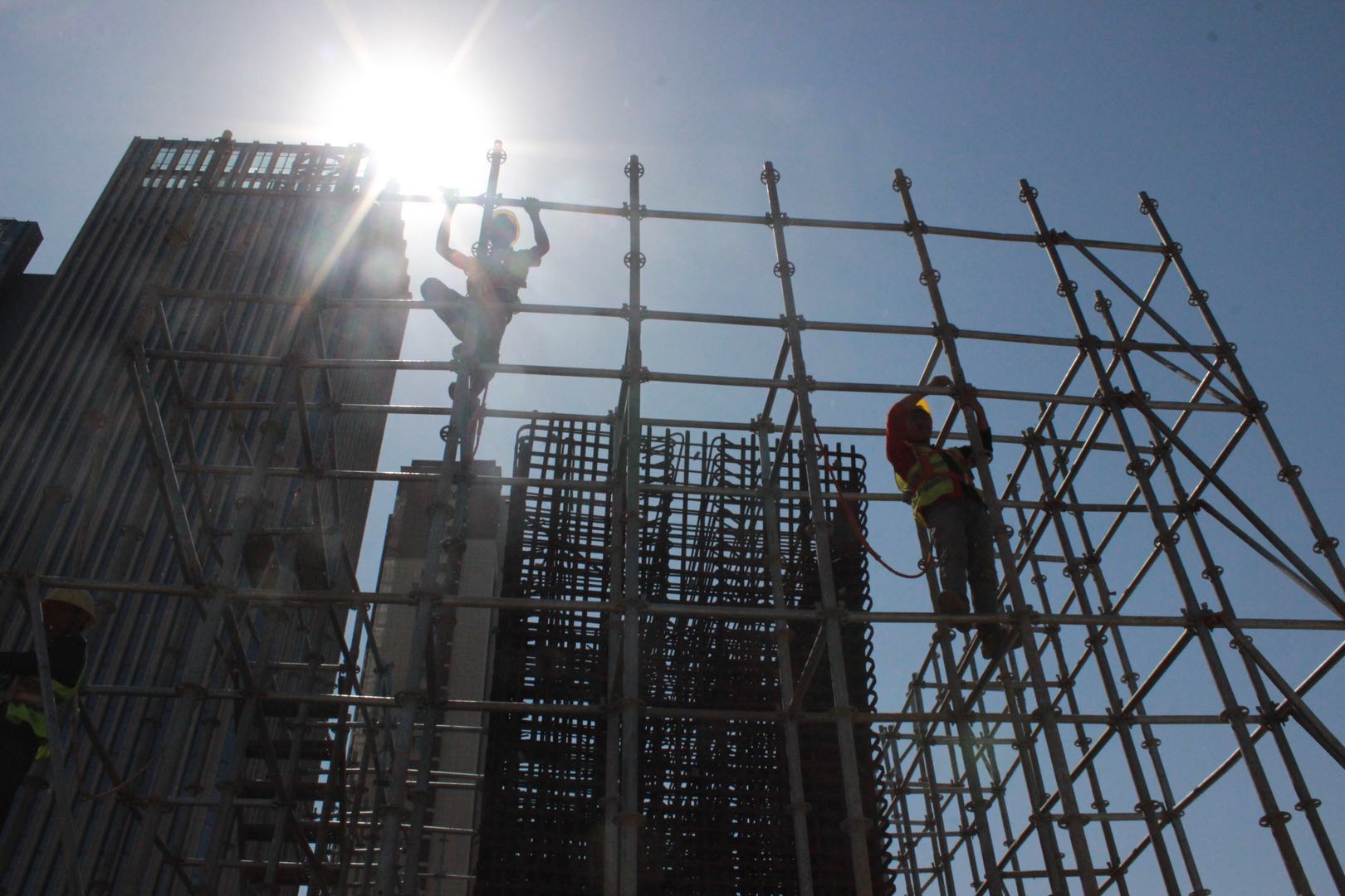 23日下午2點,蒙山大道高架北延工程的施工現場,午后正是氣溫最高的時候,氣溫接近38度。整個工地一片繁忙的景象,工人們正在高架橋墩柱上開展腳手架作業,搭建完腳手架之后,還將進行后續作業。在蒙山大道祊河橋及道路改造工程的現場,工人們也在高溫下堅守崗位,開展橋梁墩柱模板施工。