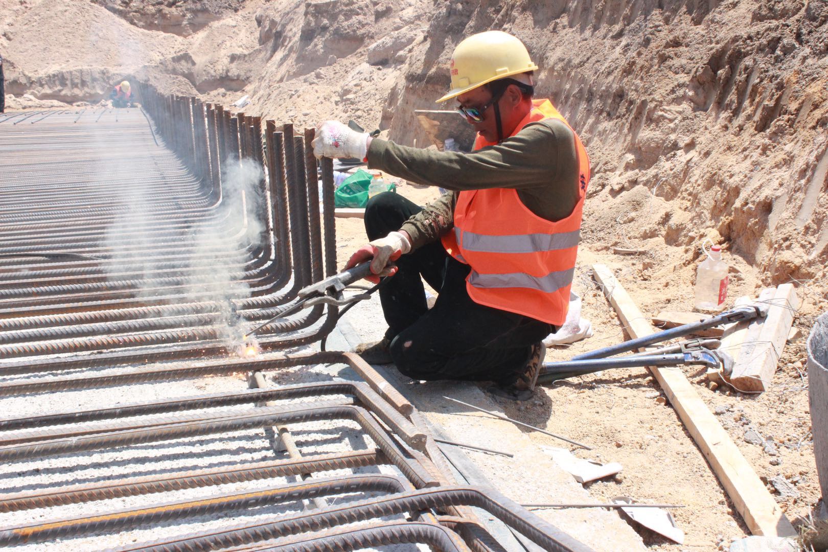 同時,在施工作業面上,工人們忙著焊接、綁扎鋼筋。熱辣辣的太陽烤著,鋼筋表面非常燙人。太陽的照射加上鋼筋散出的熱量,已經感到熱氣騰騰,工人們臉上的汗珠更是不停地往下掉??墒请姾腹こ艘淌芴柕恼丈洹C手的鋼筋等散發的熱量,還需忍受電焊噴出火花的熱浪,難怪他們的衣服都是濕漉漉的。