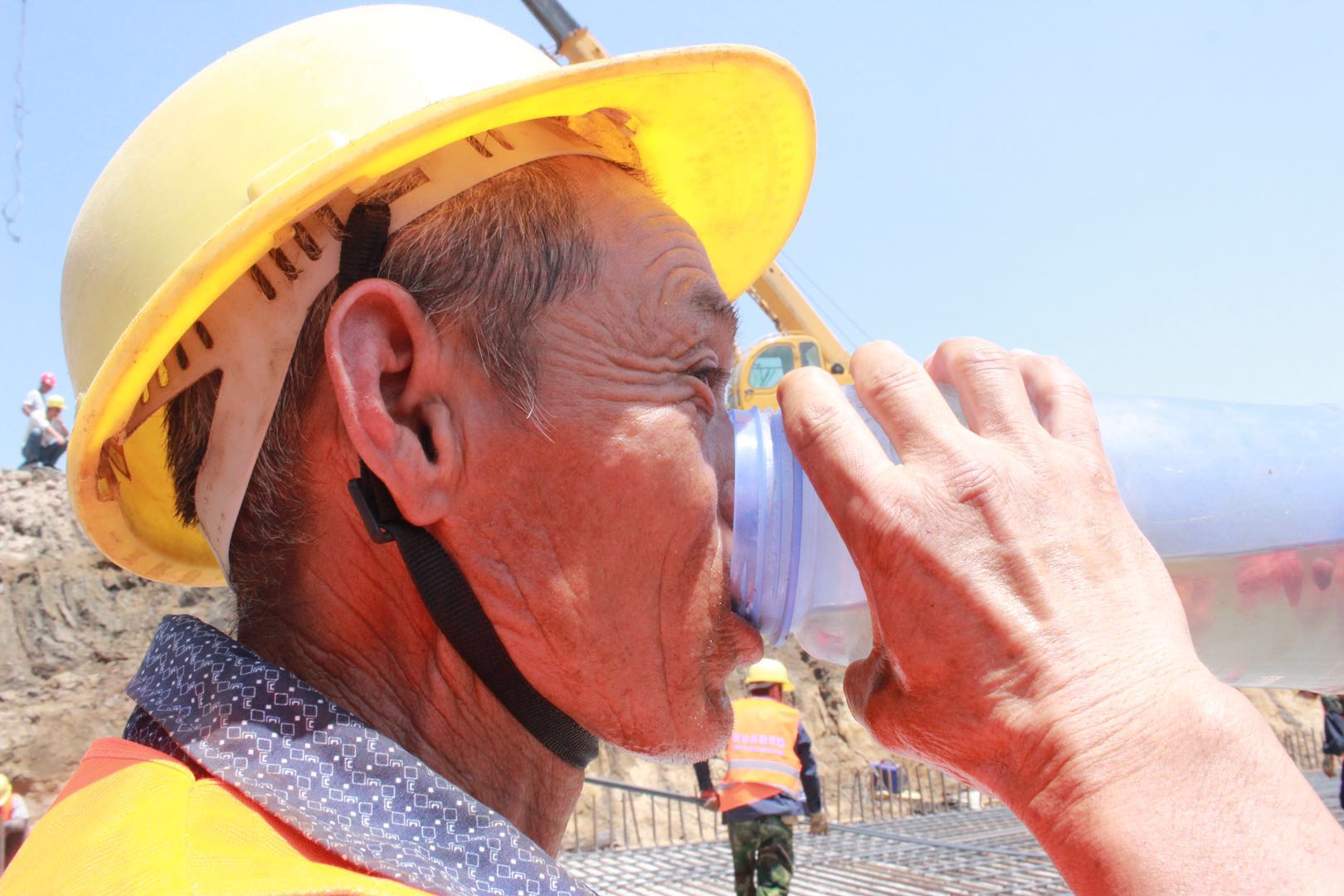 天氣炎熱,工人們出汗較多,項目部在工人聚集的地方都設置了供水點。工人們都帶著大容量的水杯,一位工人告訴記者,1500毫升的杯子,他一天能喝掉6杯水。
