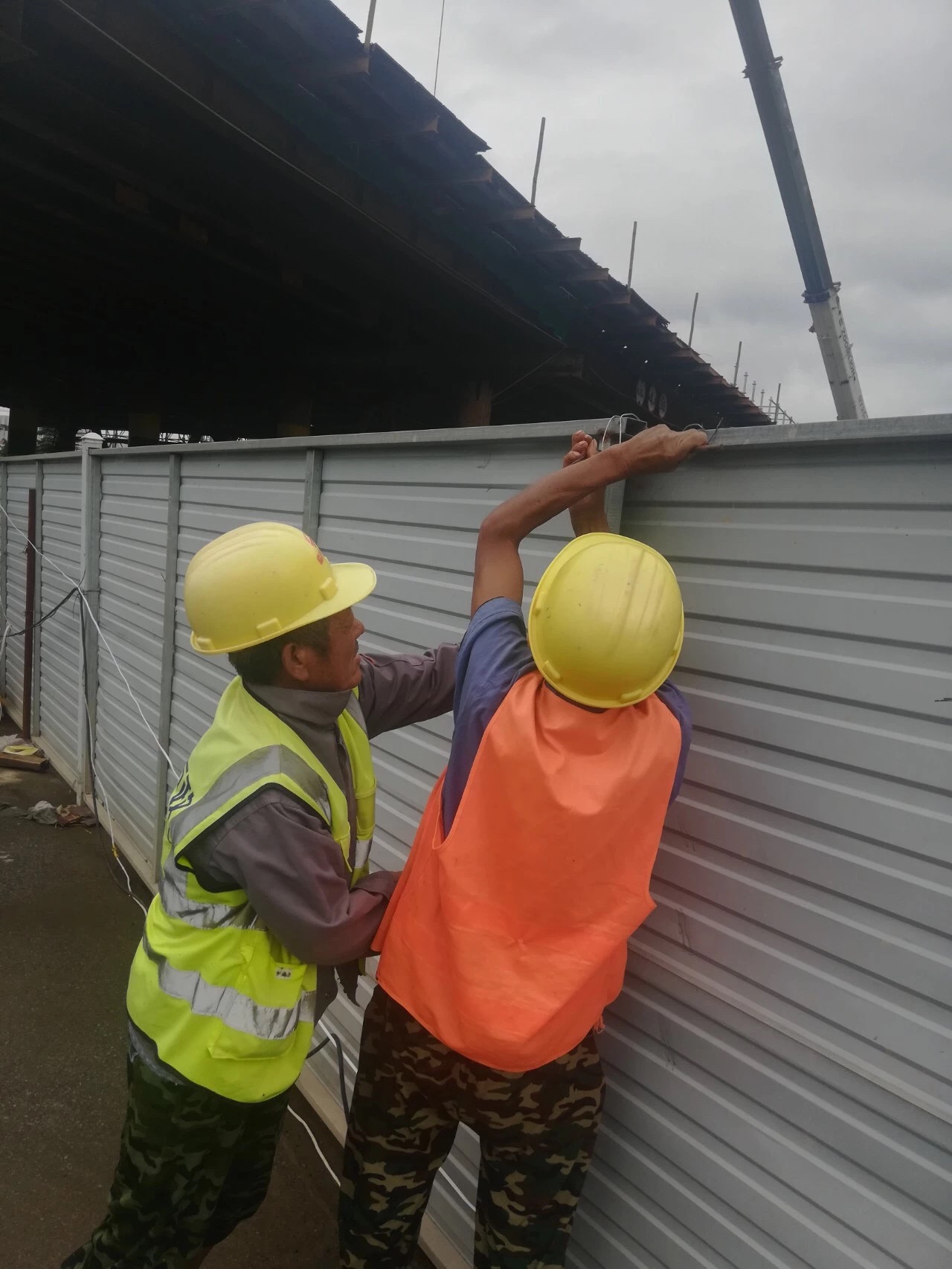 項目部接到集團安全部下發的《關于落實防汛工作安全管理》的通知后,就立即針對基坑臨邊防護、臨時用電、圍擋加固、橋面方木及模板加固等內容進行了專項大檢查,對存在的問題進行了整改,真正的做到了防患于未然。1.對臨邊防護主要涉及兩側橋面及承臺基坑,進行了重點排查,對臨邊防護缺失的位置進行了及時補充,并設置了警示標志。2.針對施工區域、各路口的圍擋進行了排查并加固。3.針對臨時用電進行檢查,臺風期間配電箱不使用的一律進行斷電。檢查開關箱的接地及一機一閘落實情況,對不符合要求的進行整改。4.對臨時設施的活動板房等進行了檢查,并采取了加固措施。5.對橋面鋪設方木、木模板等情況進行了檢查。6.為確保項目部安全度汛、防汛措施能夠有效實施,檢查汛期防汛物資的準備情況。