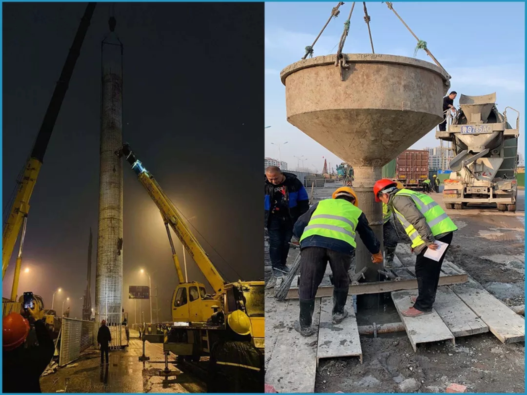 歷經53天的緊張施工,3月31日蒙山高架迎來了首排墩柱的施工。為了優質、高效、安全地完成第一排墩柱的施工,項目部采用方案先行、樣板引路的原則組織施工。其中,墩柱鋼筋在加工廠模架上整體綁扎成型,現場整體吊裝就位,加快了墩柱施工進度,縮短了現場吊裝時間;墩柱鋼模板提前試拼、校正、打磨后涂刷模板漆,提高了混凝土外觀質量;混凝土澆筑時每排墩柱均勻布置16臺振搗棒進行振搗,確保混凝土振搗密實,混凝土外觀了達到內實外光的效果。為保證作業安全,首次采用盤扣式支架搭設環形上下梯道,同時在頂面搭設安全操作平臺,既方便了現場混凝土施工,又保證了施工人員的操作安全。當看著一排排墩柱起來的時候,就仿佛看到了一個個堅強不屈、屹立蒼穹的市政鐵軍建設者。