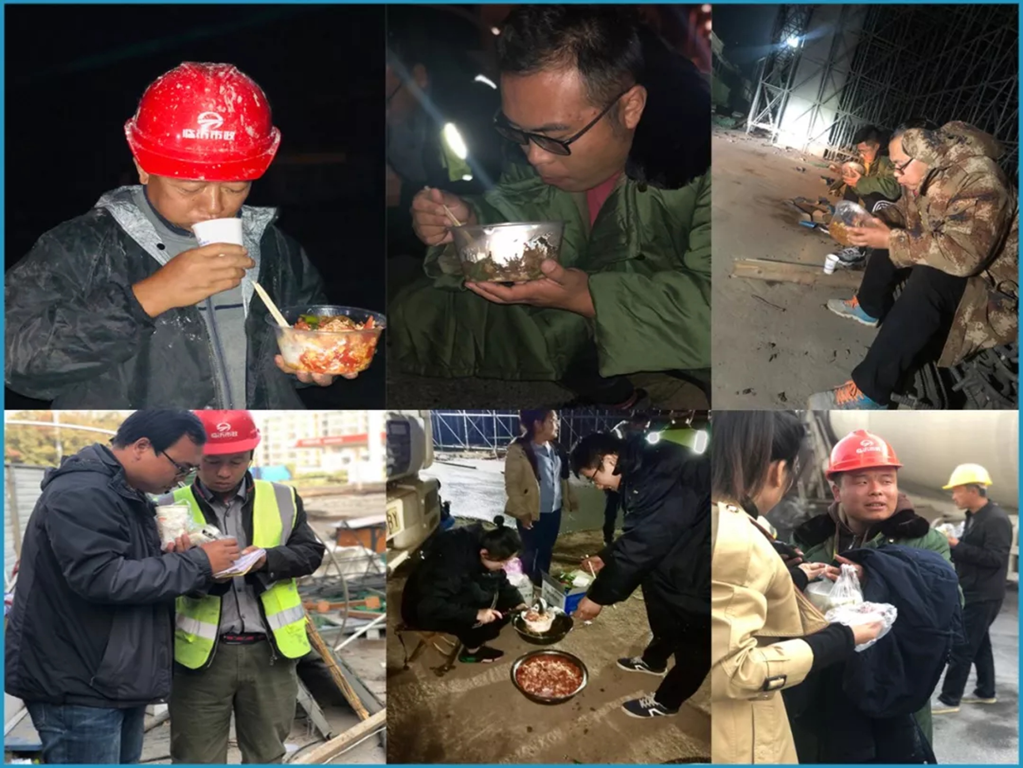 一線人員晝夜不停忙碌的同時,蒙山高架后勤人員也積極配合。為了讓工地現場的同事們騰出時間休息一下,在忙完各自手頭工作后,到工地現場幫忙收料、指揮交通。深秋的夜里氣溫驟降,后勤人員自發組織午夜時間輪流到工地上送加班餐,只為能讓施工人員吃上一口熱飯。每當看到施工員們吃飯時臉上露出的笑容,既讓我們感到了欣慰,也讓我們感覺到了心酸。就連吃飯的這一點點時間施工員們都在討論施工情況,這就是市政人投入工作時的忘我精神!