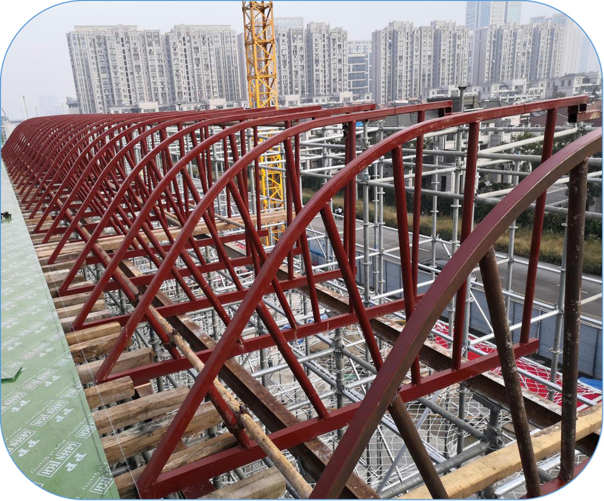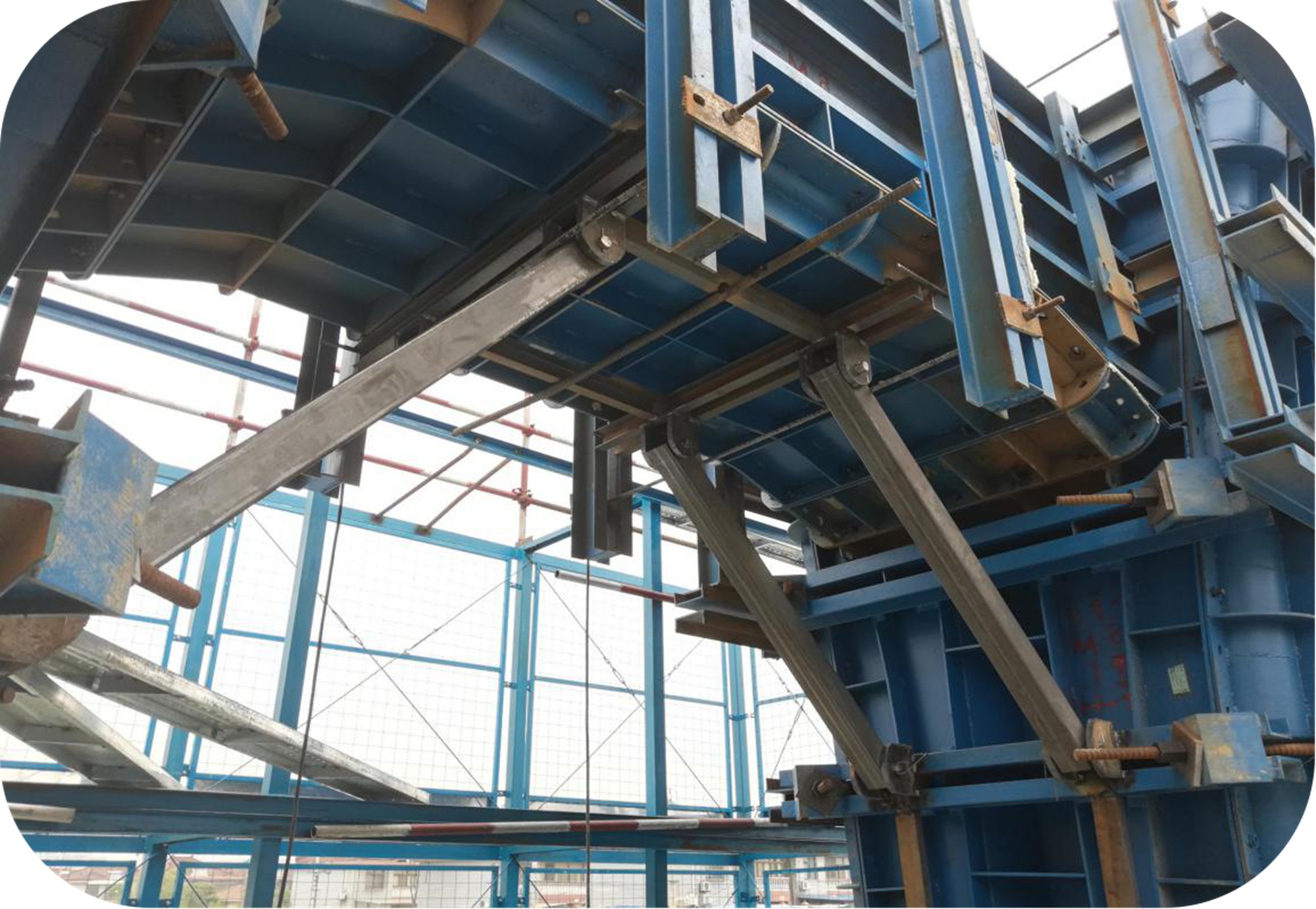 傳統控制現澆箱梁外觀質量,采用鋼管彎曲作為骨架,但鋼管強度剛度較低、組合整體穩定性較差,線型控制難度大,易發生彎曲位移。本創新——一種組合式箱梁圓弧模板支撐架,能夠保證箱梁弧線段線型控制,成品外觀質量較好。并且此創新采用場內加工,現場組裝的方式,箱梁澆筑完畢后,支架可以整體轉移,重復利用,可提高箱梁支撐架的搭設效率。