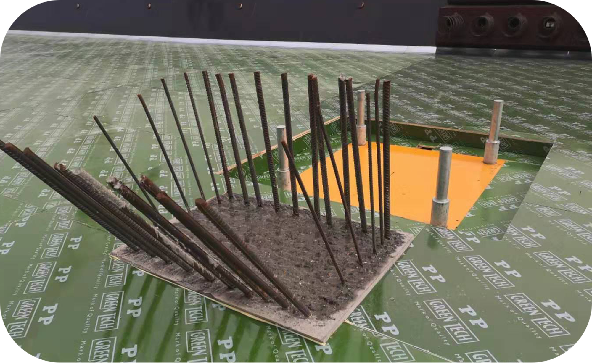 傳統水下鉆孔灌注樁施工,樁頭鋼筋往往不進行處理,混凝土包裹鋼筋,鑿除困難;或采用PVC塑料管進行套裝,方便樁頭鑿除過程中的鋼筋剔除與脫離,但是PVC塑料管材質較硬,套裝難度大。本創新樁基鋼筋籠,套管為柔性材料,能很好的避免水泥漿的進入。將套管上下采用扎絲封口,避免水泥漿進入的同時有效避免套管上浮。采用本創新能夠實現樁頭鋼筋與混凝土的物理隔離,為樁頭鑿除和整體調離提供先決條件。
