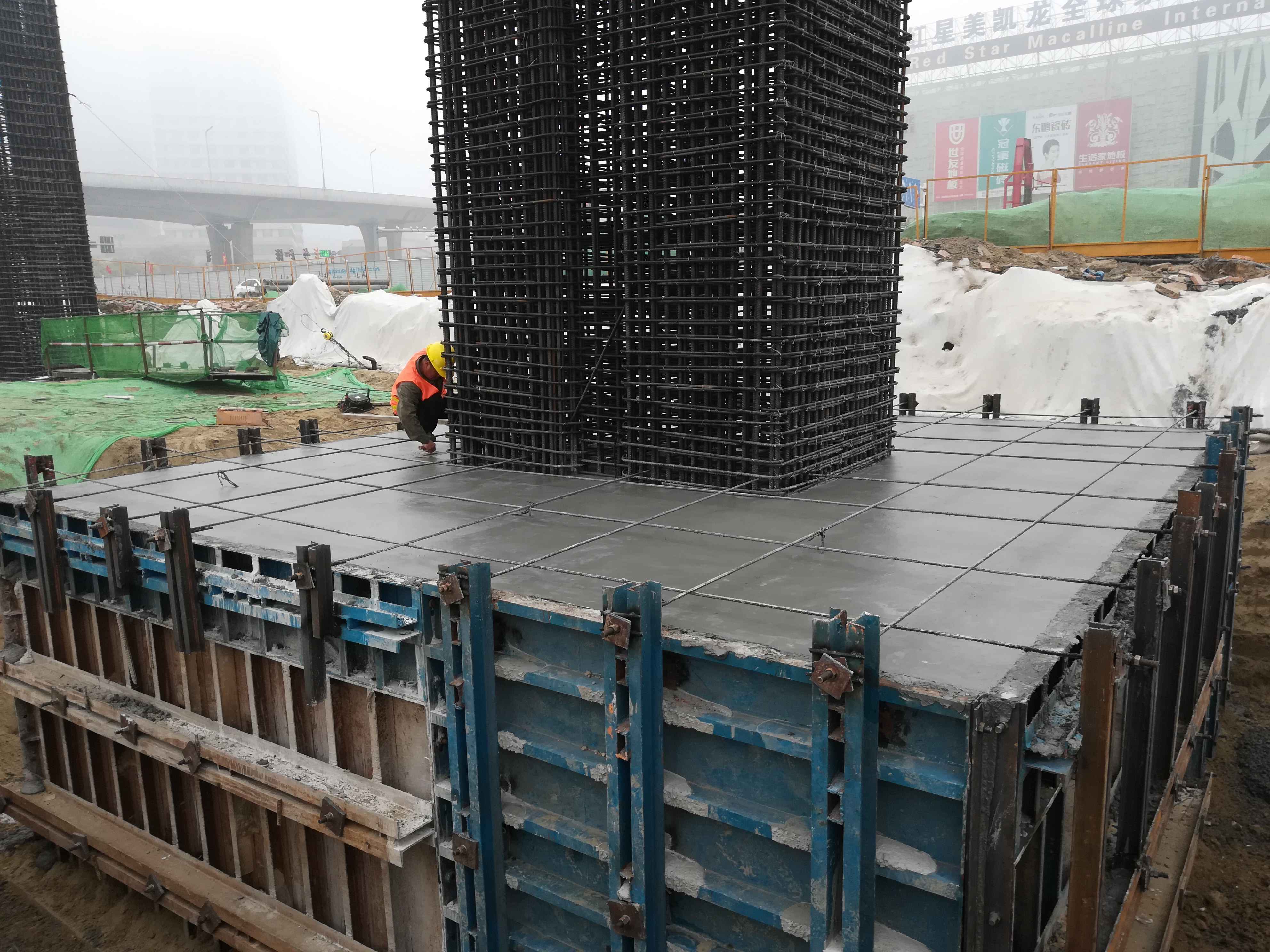 此時,32歲的山東大漢彭奕盛開心得像一個小孩。他是負責潤揚路項目承臺施工的施工員,一副結實的身板,一雙炯炯有神的眼睛里透露出一種堅毅。直男的性格里,更多的是對人對事的一絲不茍。自承臺施工工序開始至今,整個承臺現場施工都由他全程負責。