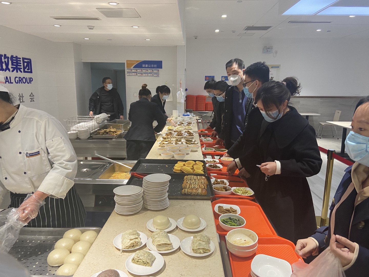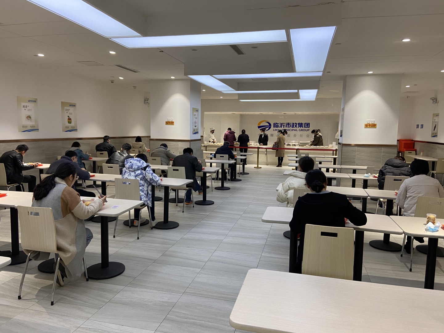 按照“少外出、不聚集”要求,午餐實行錯時輪流用餐,用餐時間調整為11:30 至13:00。如果要就餐,需要前一日將就餐人數統一報送食堂,餐廳為每位員工發放一次性餐具,員工就餐時還要進行體溫檢測。